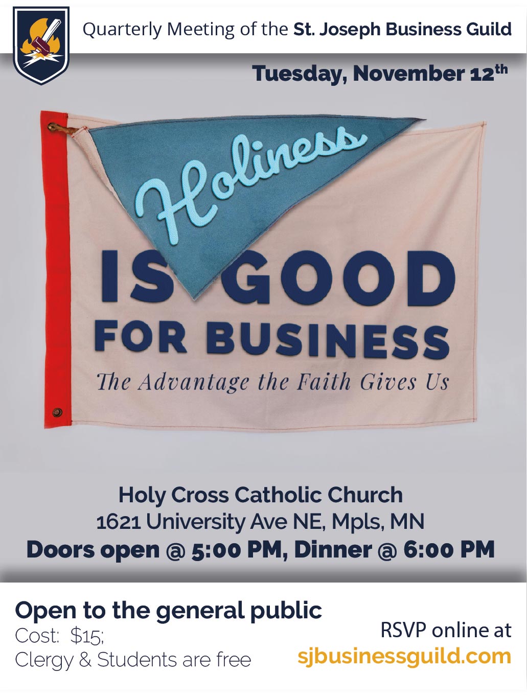 The general public is invited to the St. Joseph Business Guild’s next quarterly dinner meeting at Holy Cross Catholic Church, on November 12th!